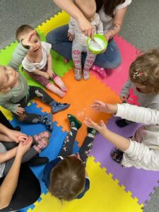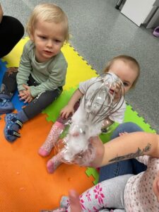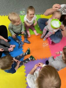 Nasze dzieci uwielbiają puszczanie baniek. Dlatego w naszym przedszkolu i żłobku robimy to dość często. Staramy się wspierać rozwój mowy dzieci, dlatego zabawa z bańkami rozpoczyna się już w najmłodszych grupach.