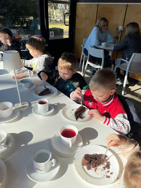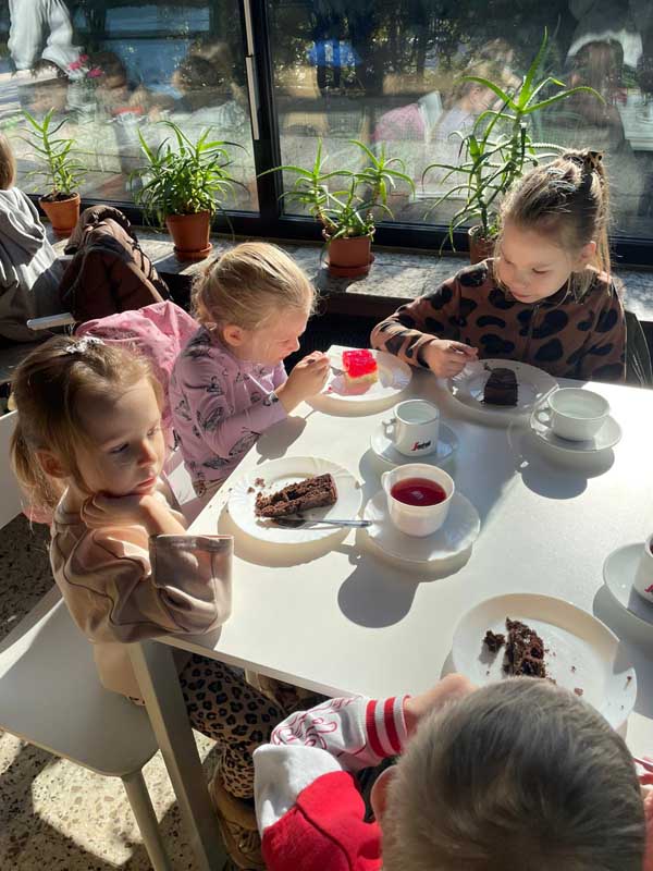 Oczywiście wizyta nie mogłaby się udać bez degustacji. Na zakończenie spotkania na dzieci czekał pyszny poczęstunek. Mogliśmy spróbować specjałów, z których słynie Cukiernia Dorotka. W menu znalazły się puszyste ciasta, ciasteczka oraz największa specjalność – lody cassate.